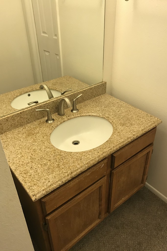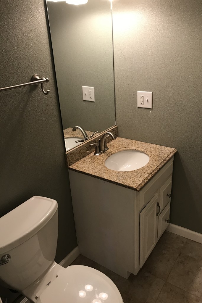 – Install new bathroom vanity (including countertop, mirror, sink, and faucet)